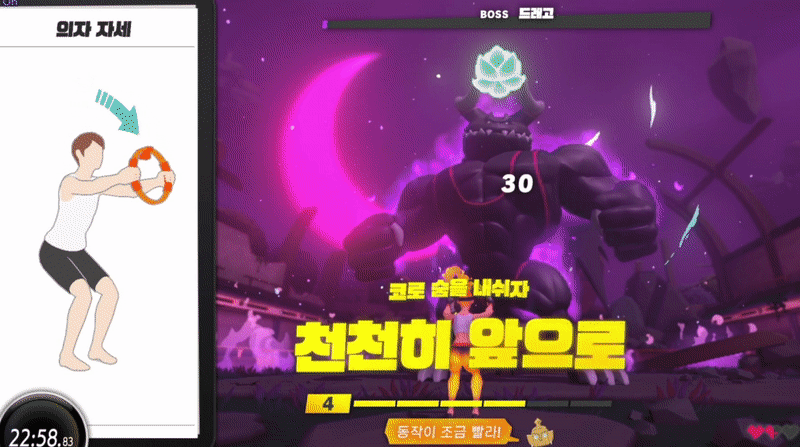 운동효과에서 말씀드리면 화면의 캐릭터의 화면 움직임에 맞추어 움직이니 운동 영상 보며 적당히 따라하는