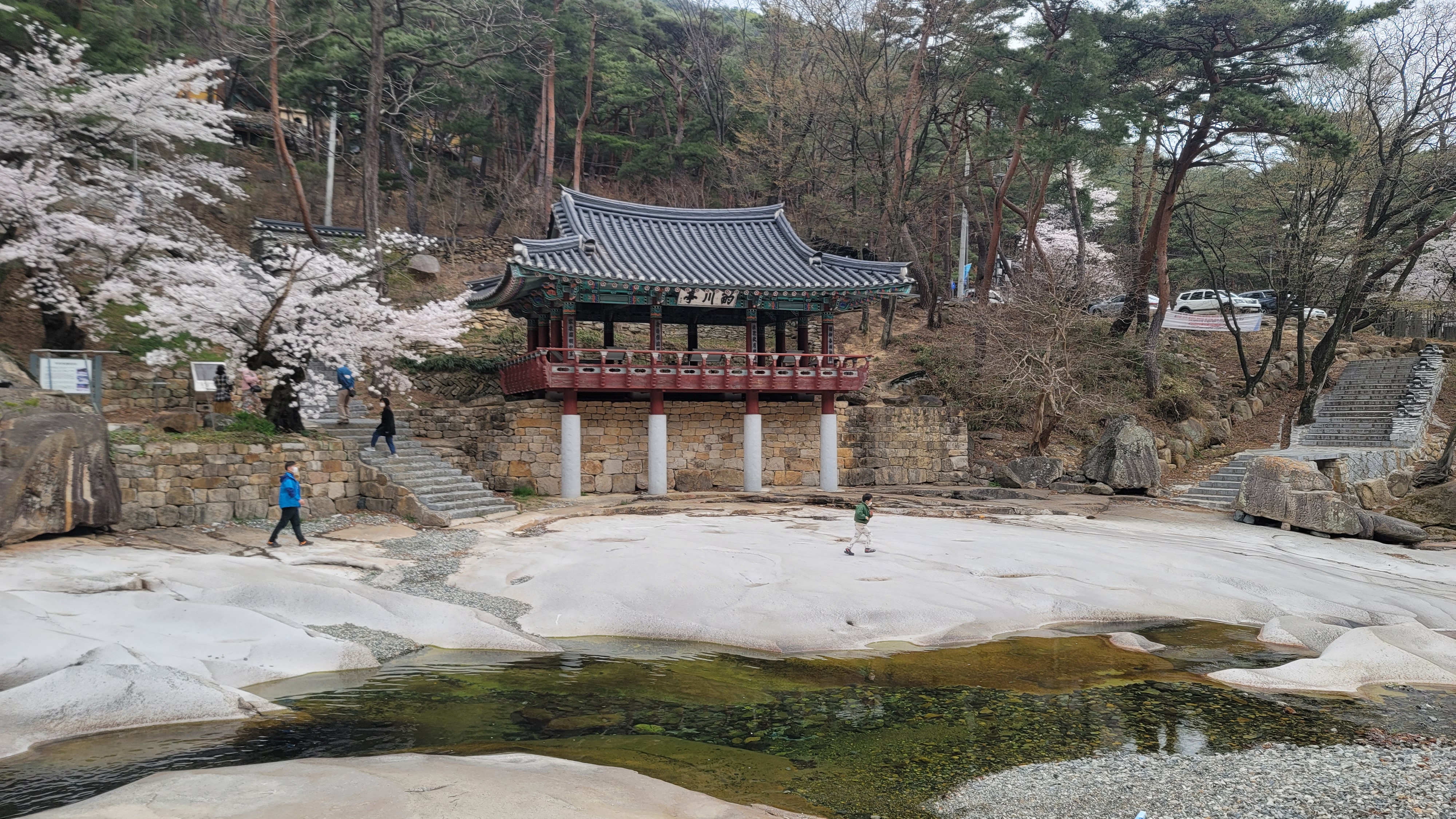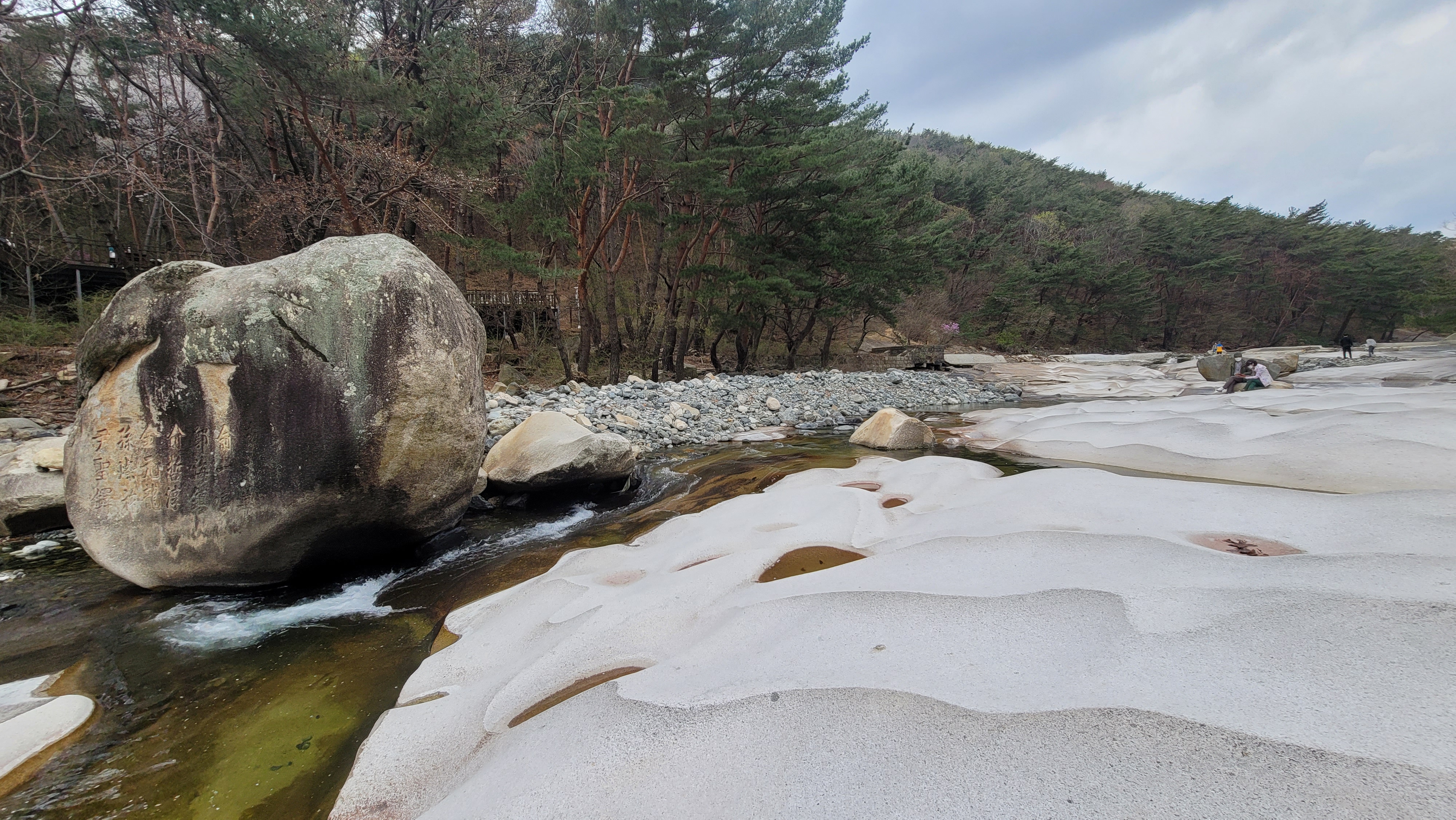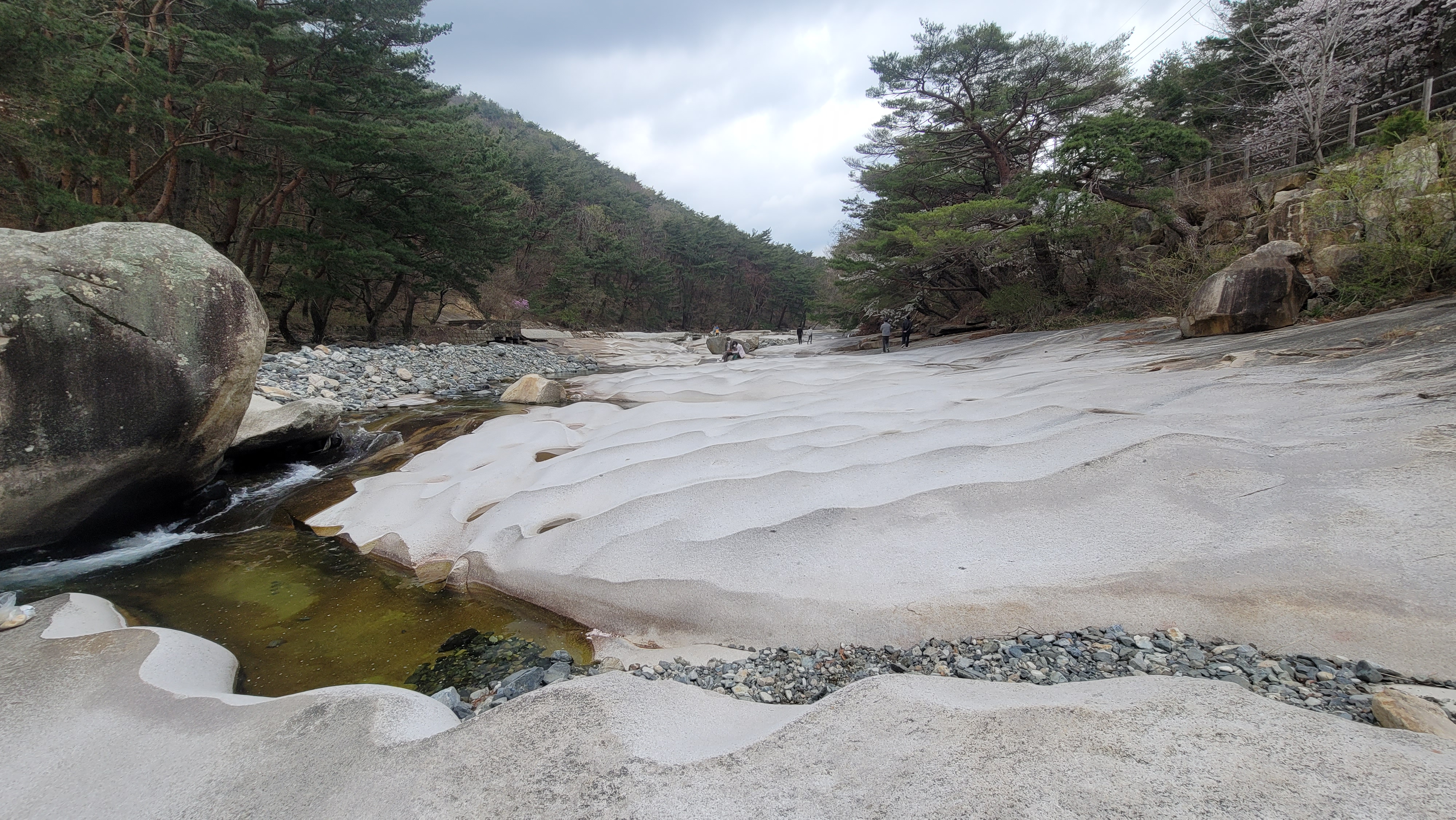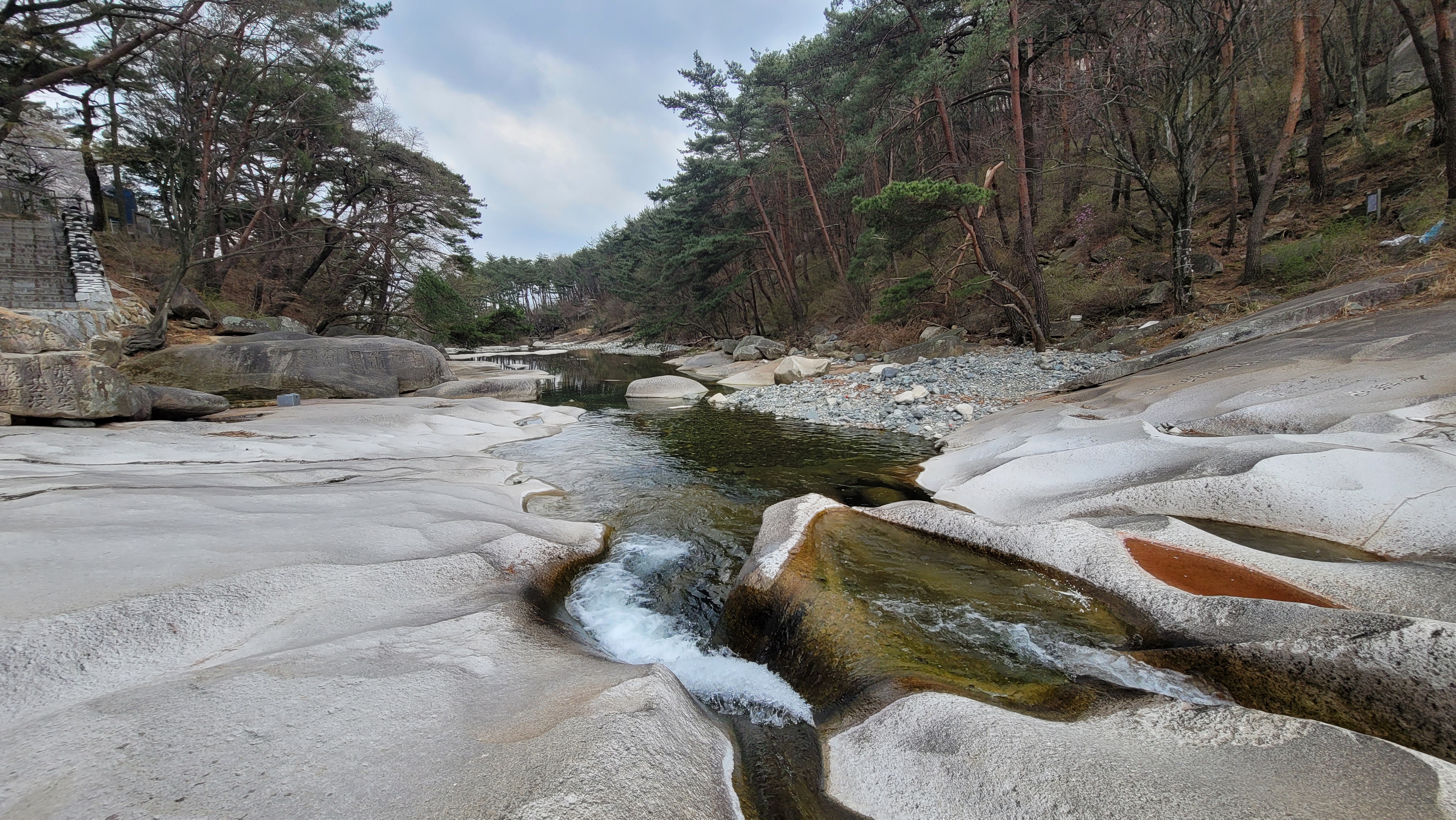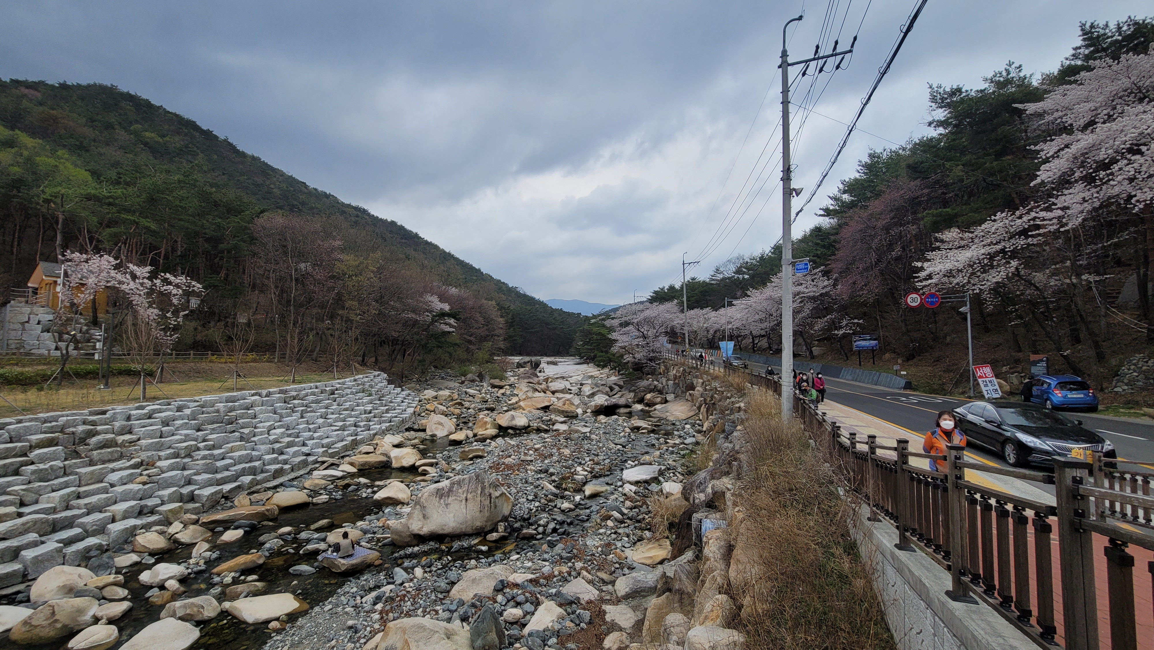 벚꽃 나무 구간을 지나면 작괘천 계곡이 나옵니다. 도로 옆 계단 밑으로 편히 내려갈 수 있으며 처음 와보면